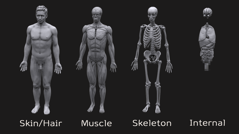 More than 900 objects are organized into 4 layers: "Skin / Hair", "Muscles", "Skeleton" ,"Internal"